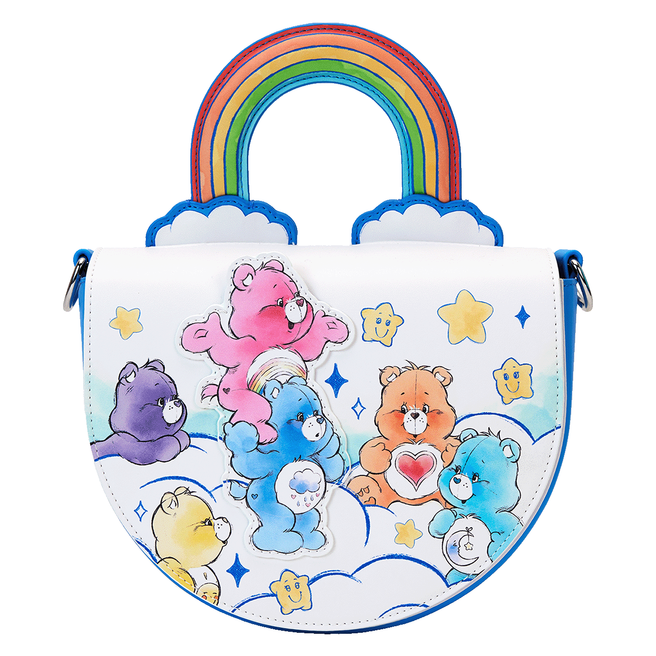 Prepare to stare! This Care Bears™ crossbody bag is carefully designed to bring so much joy. The front flap of this half-moon style bag features an applique of Cheer Bear™ standing on the shoulders of Grumpy Bear™, and they’re surrounded by other Care Bears who are playing among the clouds. Lift the flap, and you’ll find colourful print hearts. The handle is a padded applique in the shape and colours of a rainbow! Two applique clouds appear below, and a detachable vegan leather charm of a smiling sun tops off the look. Pack just what you need for the day to gather your friends and spread kindness wherever you go.