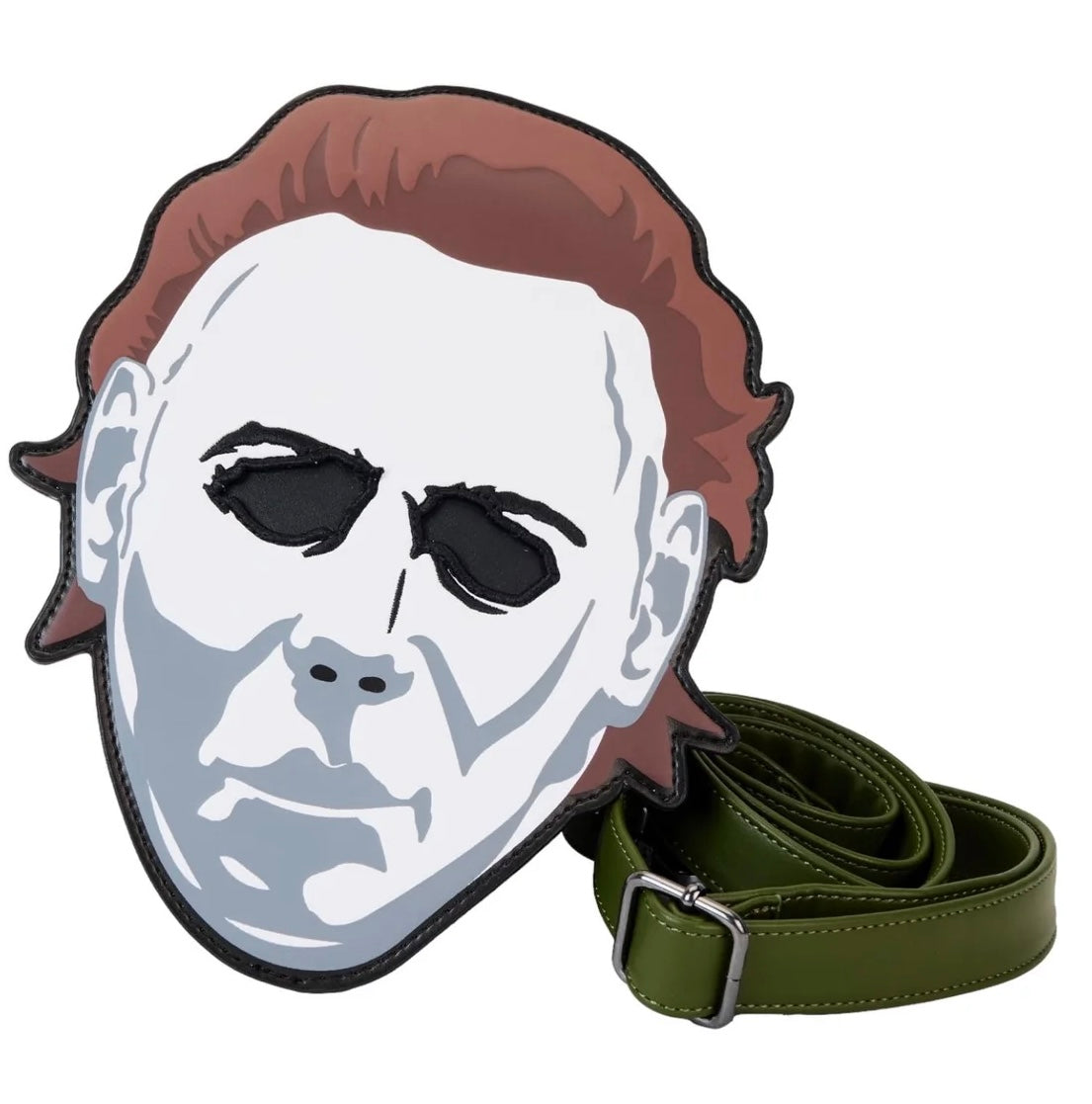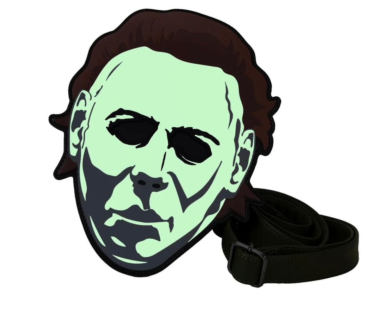 Crash the haunted hayride party looking sharp. Bring along our Loungefly Compass International Halloween Crossbody. This oval-shaped, “canteen” silhouette accessory features Michael Myers in eerie applique and printed detail. His mask appears on the front, and in the dark, it glows! On the back, a print displays a “window” view of Michael Myers, peeking through the shutters. Pack your daily essentials and stalk your favourite haunts in style.