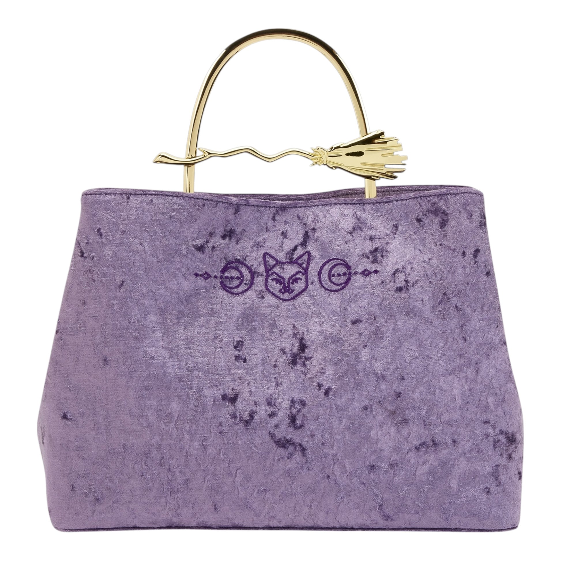 This purple velvet handbag has faux leather trim. You'll find embroidered symbols on the front of crescent moons and a cat. The top handle is golden molded metal and features a witch's broomstick!