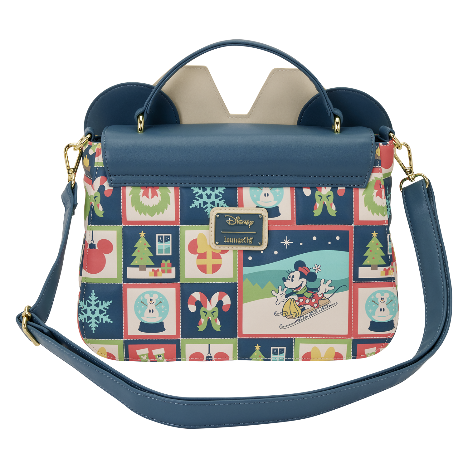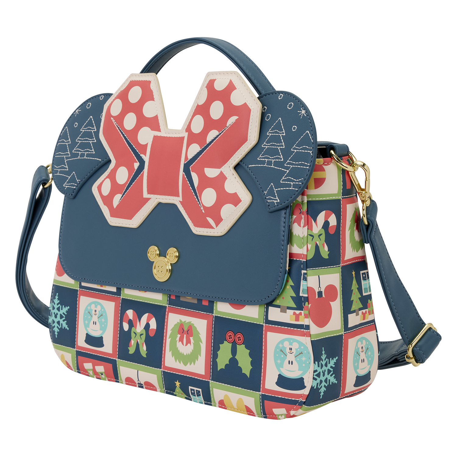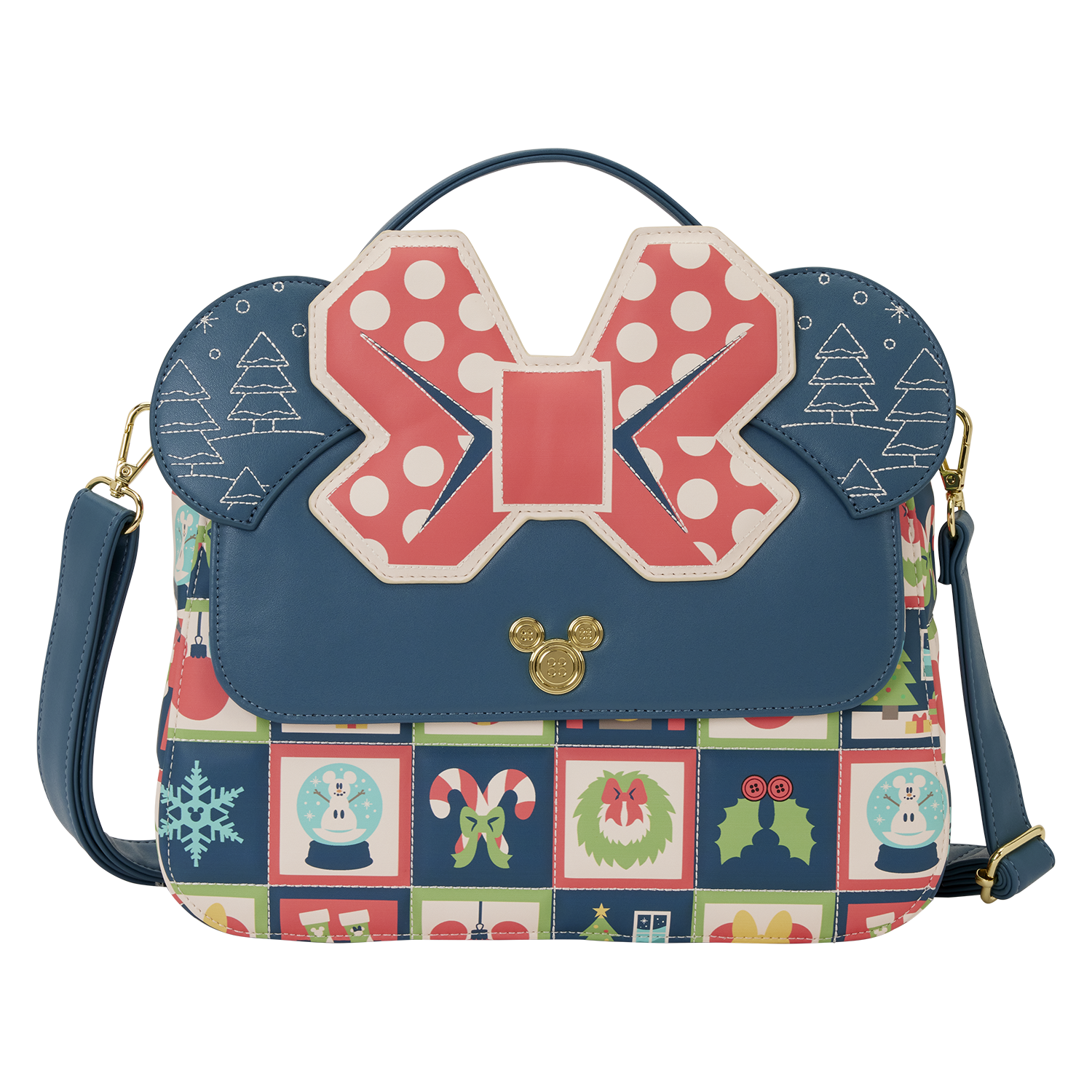 Cute style for the holidays starts here! This crossbody bag is inspired by Disney's Minnie Mouse! You'll find an all-over pattern that features padded debossing of snow globes, candy canes, wreaths, snowflakes, and more. You'll find a molded metal rivet of Mickey Mouse's silhouette on the front flap. You'll also find applique ears and Minnie Mouse's bow at the top!