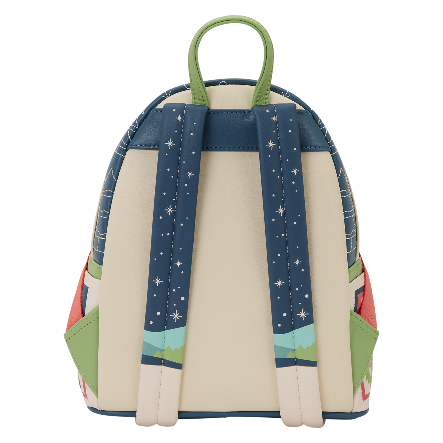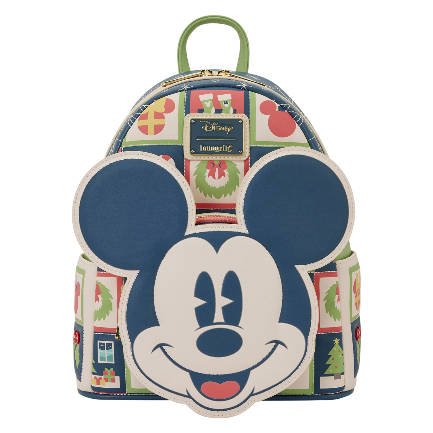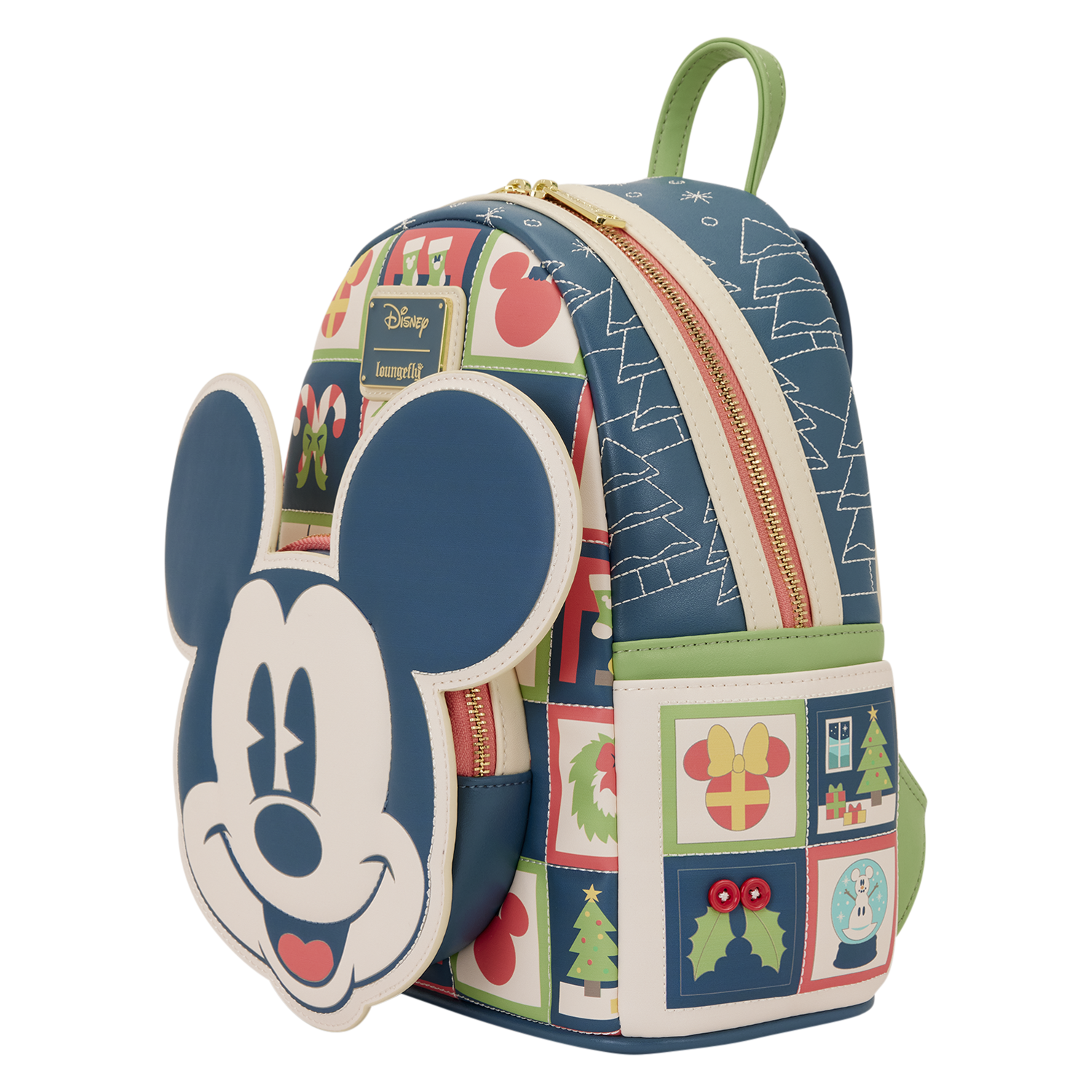Deck the halls with Disney style! This mini backpack is the perfect festive accessory for the season. On the front and side pockets, you'll find padded debossing of various holiday symbols, including holly, wreaths, stockings hung over a fire, and a Mickey-shaped ornament! The front pocket features an applique of Mickey Mouse! The top of the bag features quilted material with images of evergreen trees and an embroidered starry sky is featured on the straps!