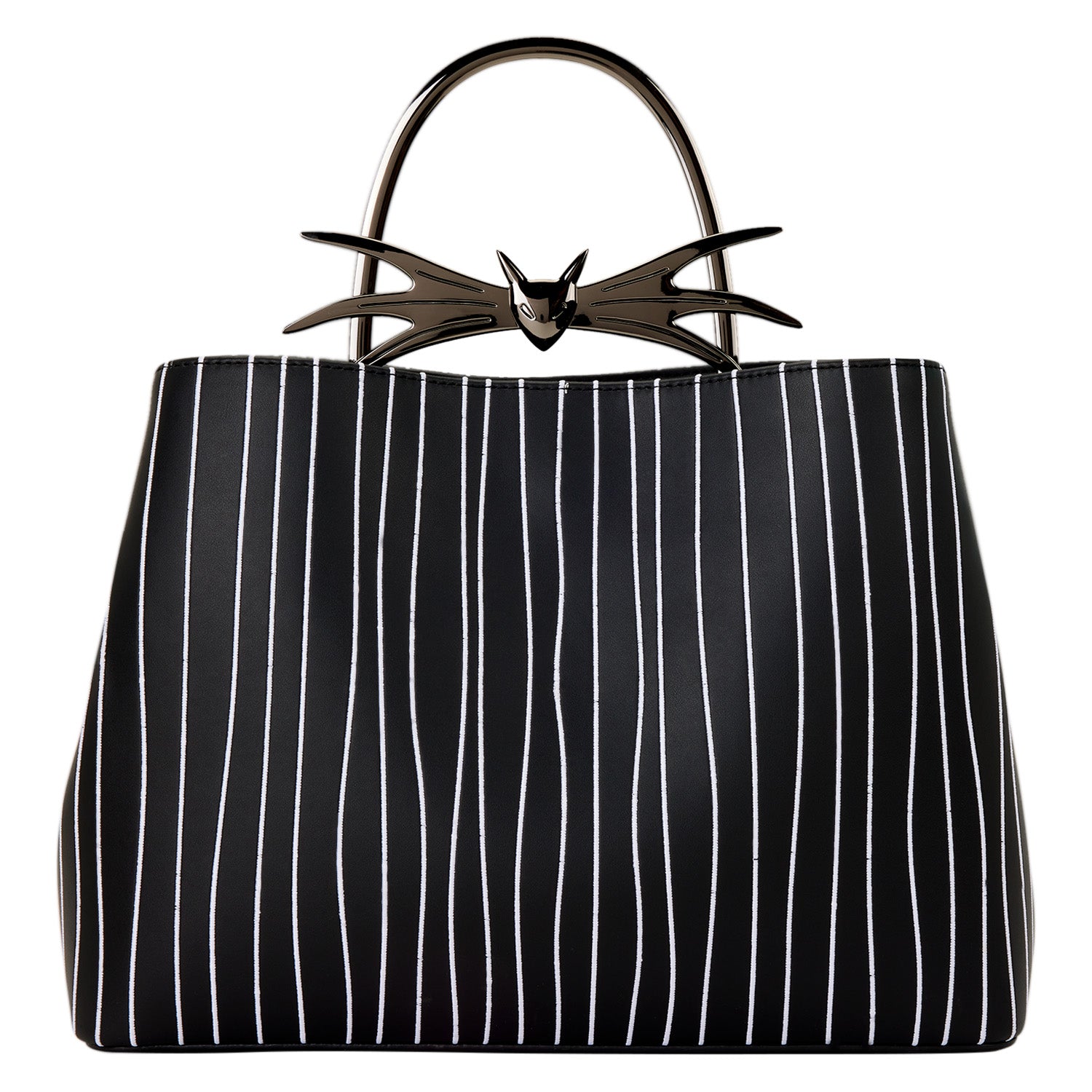 This handbag is inspired by Jack Skellington's suit, complete with embroidered details of Jack's pinstripe suit. A metal handle sticks out from the top and has a sculpted-metal bat bowtie attached to it. It also glows in the dark!