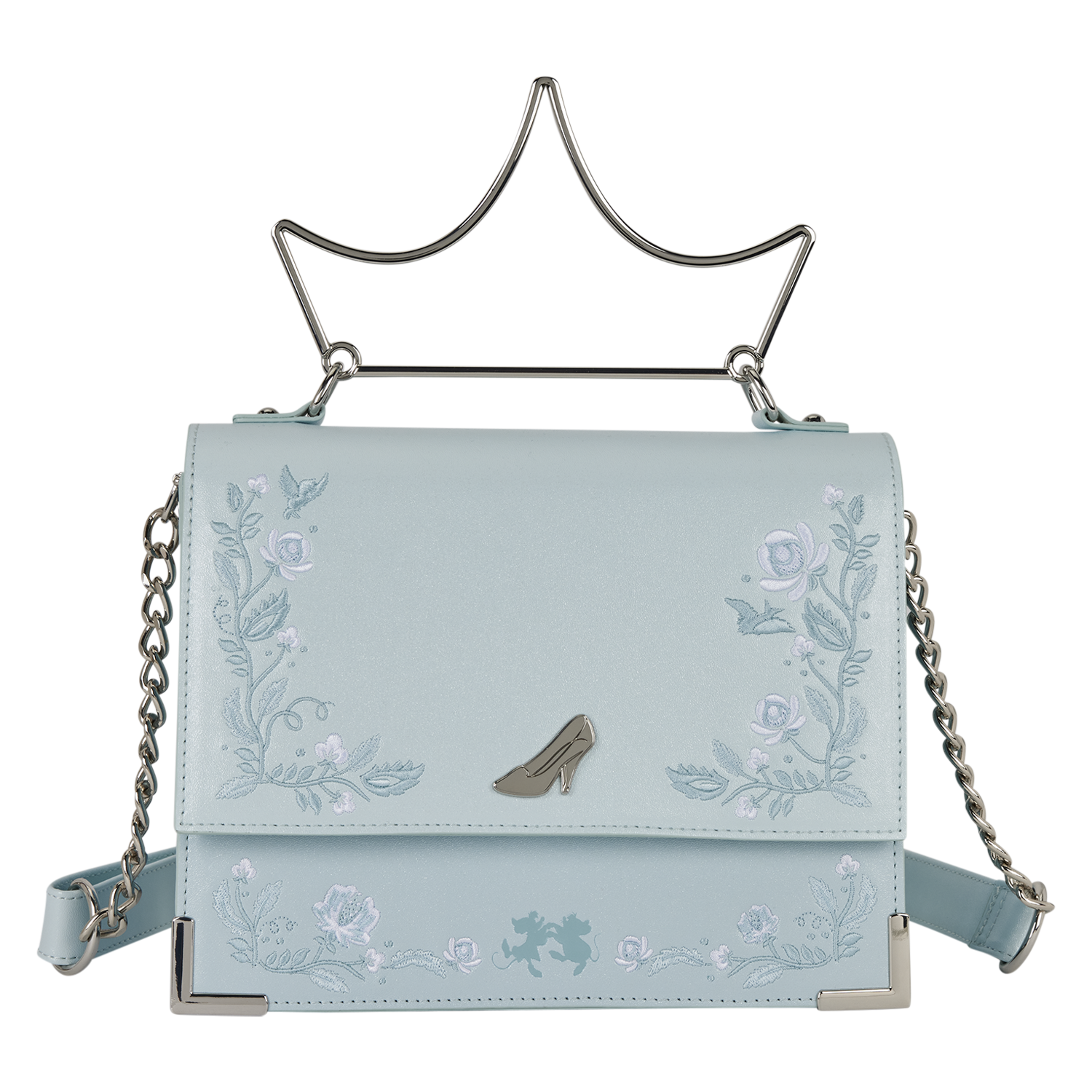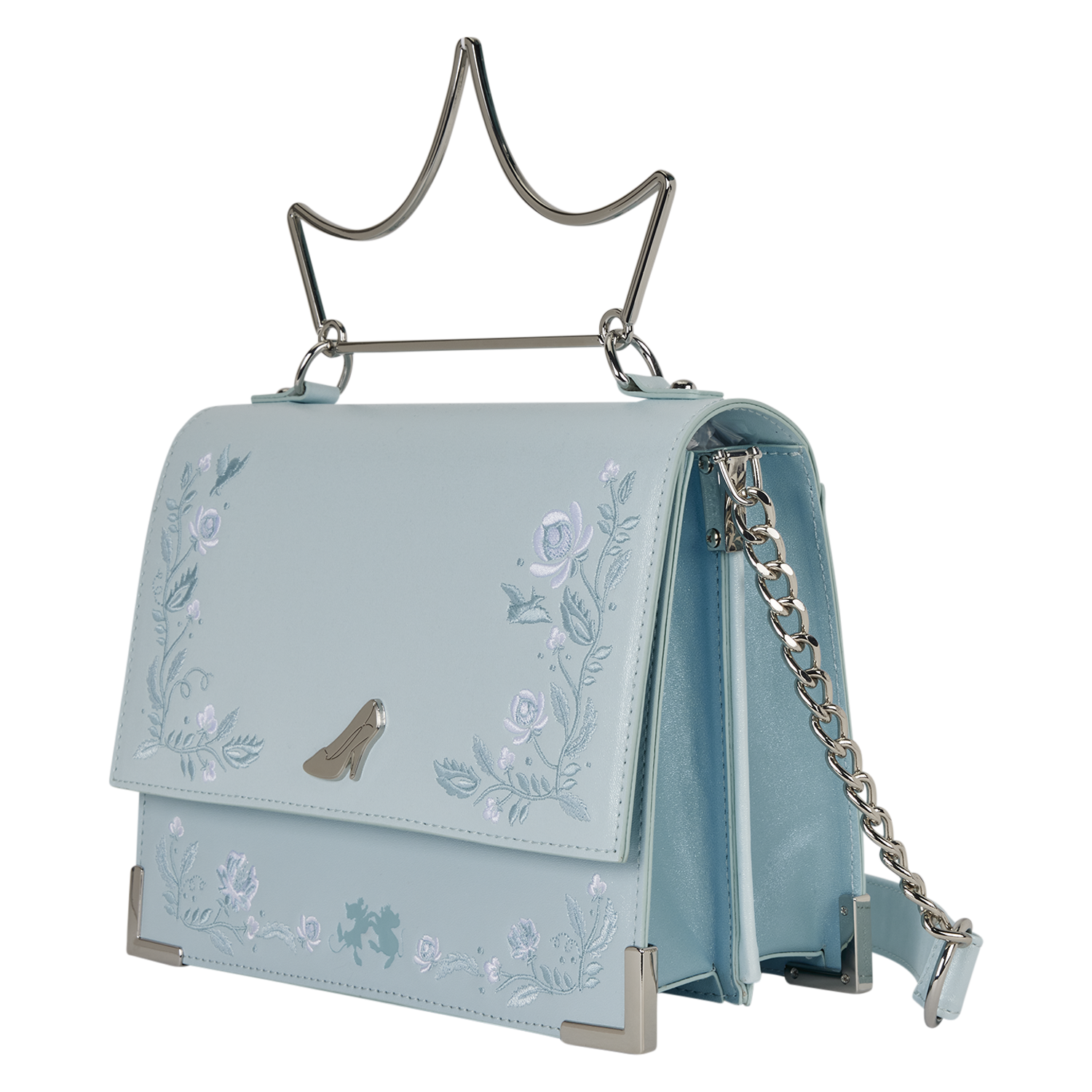This bag features shimmery faux leather with embroidered floral details. In the center of the front flap, you'll find a molded metal charm of Cinderella's glass slipper. Attached to the top is a molded metal top handle in the shape of a tiara.