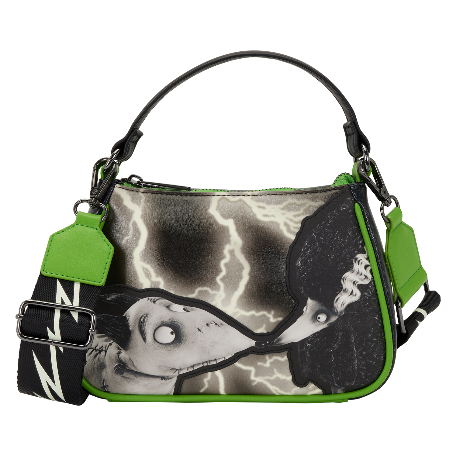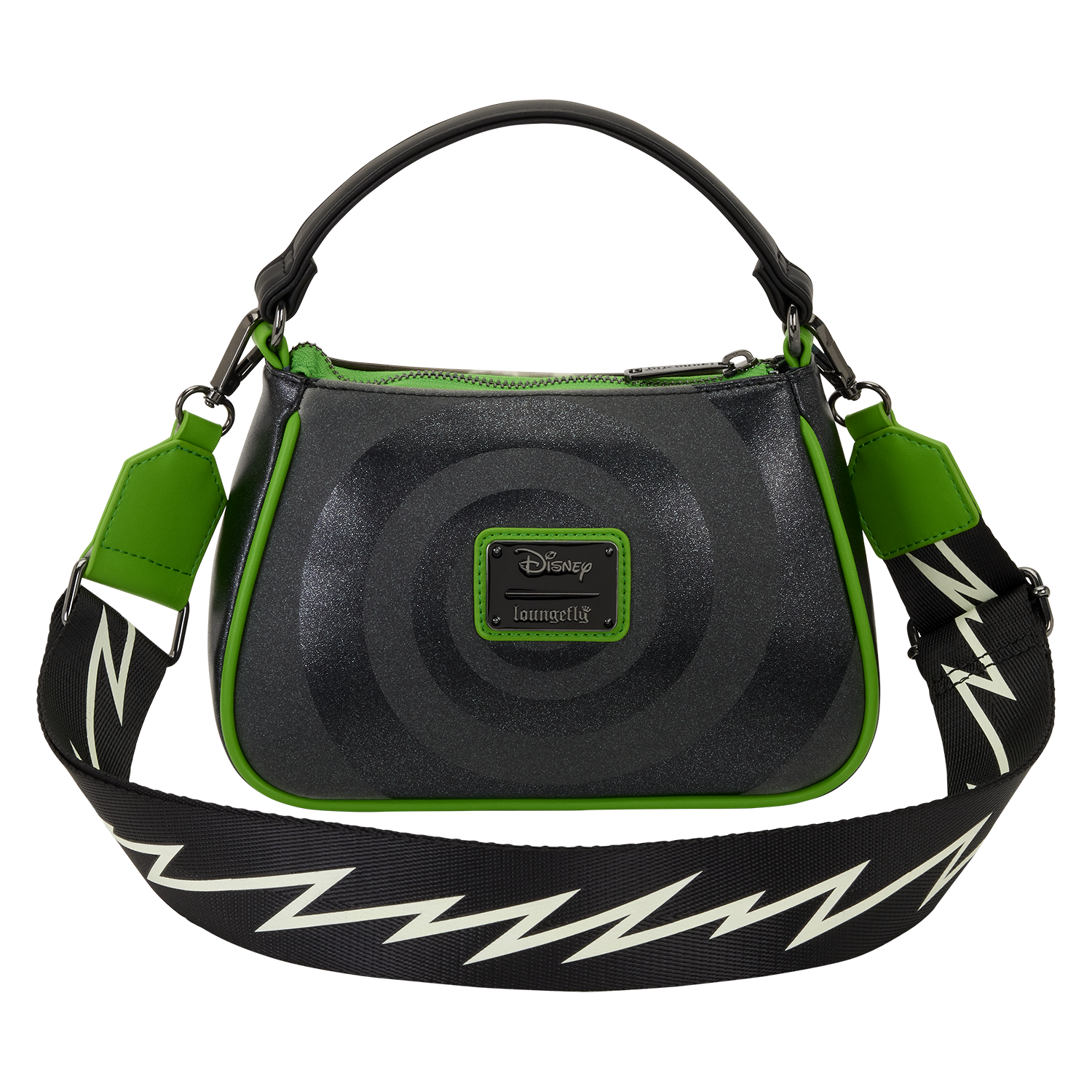 This crossbody bag features Sparky and Persephone from Frankenweenie. They're surrounded by glow-in-the-dark lightning strikes. Turn the bag around to find a swirling design that also glows in the dark. The adjustable crossbody strap has a lightning design on it.