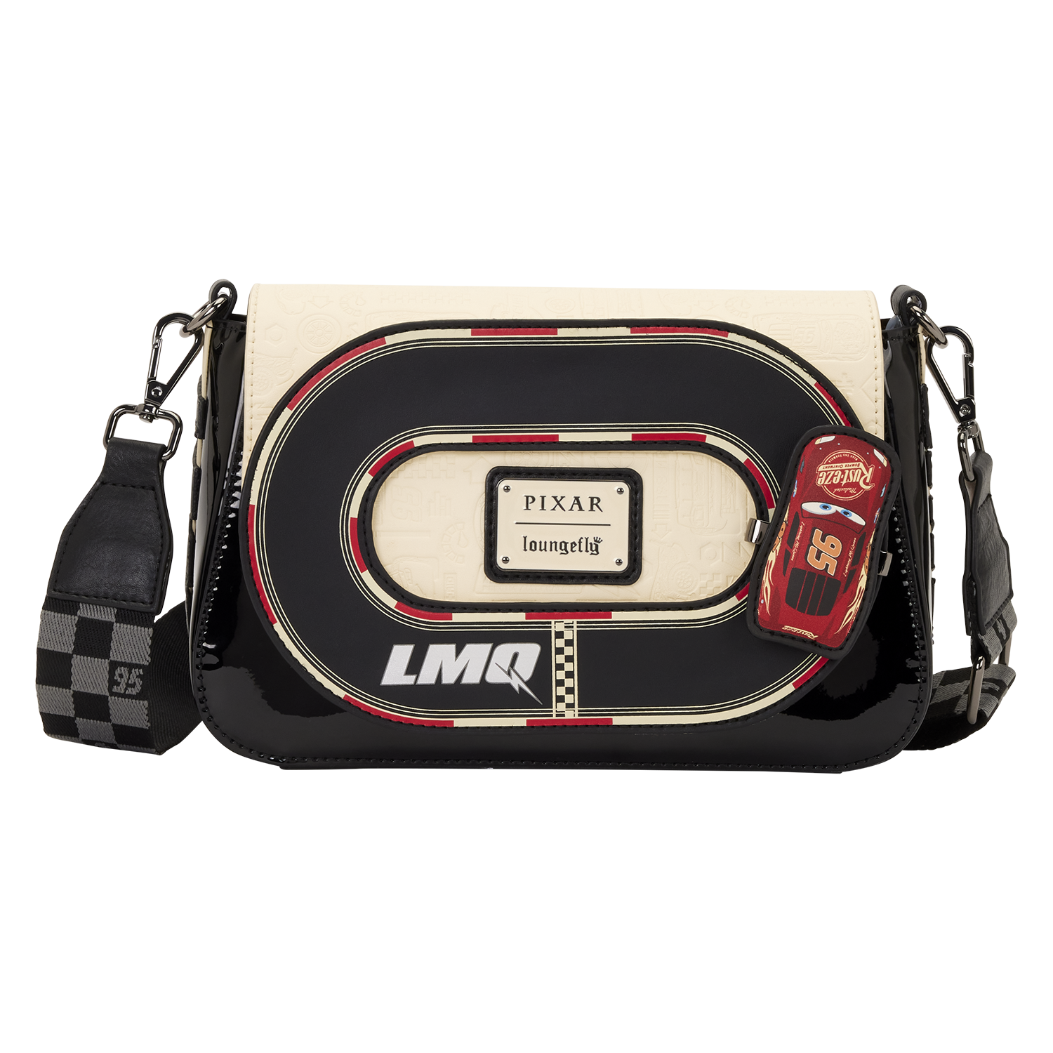 This crossbody features a racetrack on the front flap. An applique of Lightning McQueen actually moves around the track! Pretty epic, right?! The body of the bag is made of glossy patent faux leather for an elevated feel. You'll find "95" written on the back of the bag and a checkered pattern on the crossbody strap.