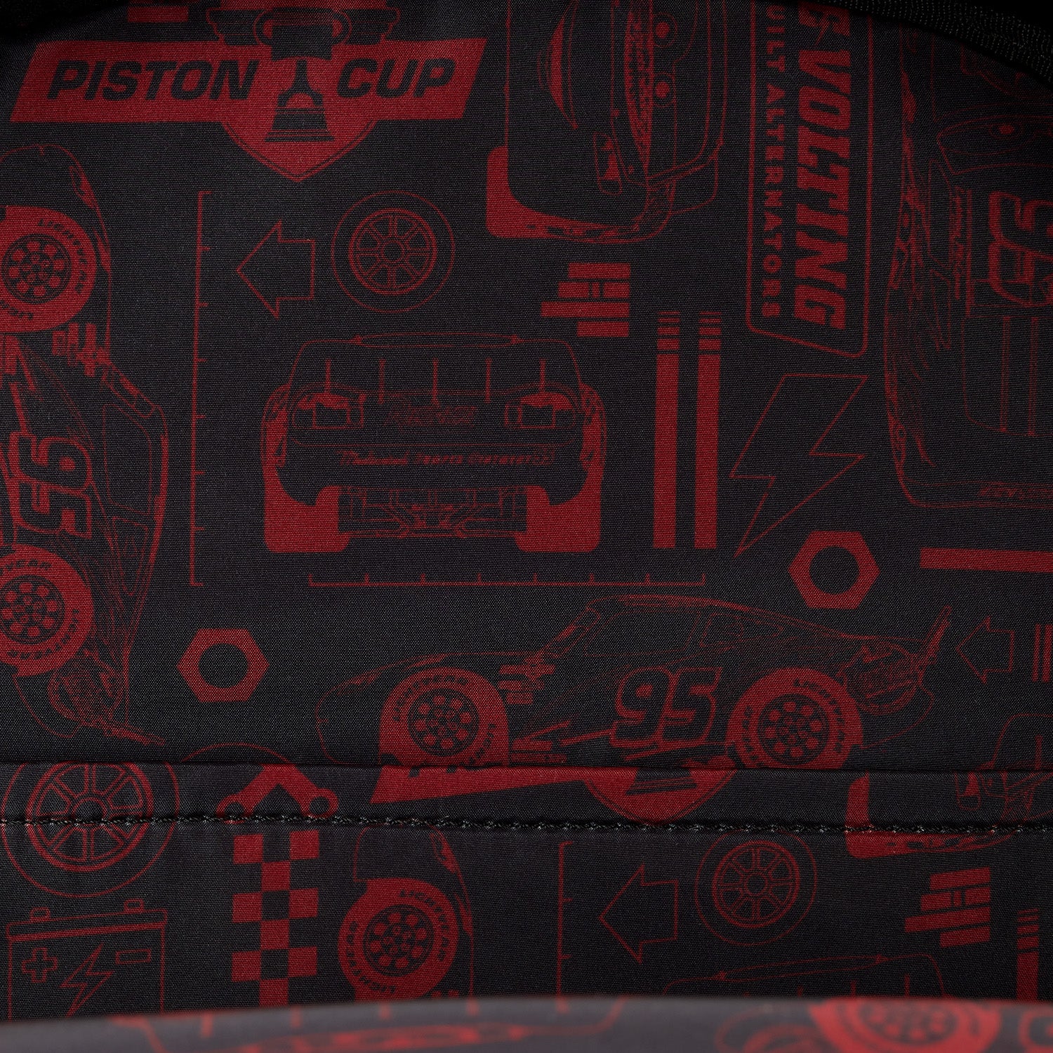This full-size backpack features various images of Cars characters in white against a black background. The front pocket is shaped like a tire that says "Lightyear" on the side, and there are molded metal rivets in the center! The straps are half-white, half-red, and feature an applique of the number "95".