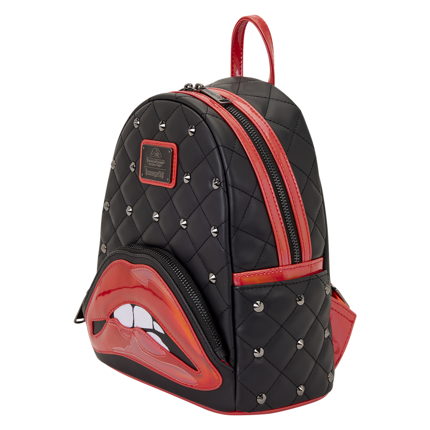 This mini backpack is an absolute staple for spooky season! After all, it's Rocky Horror Picture Show season! This bag features black quilted material with stud cones. The front pocket is a puffed applique in the shape of the iconic lips from the beginning sequence.