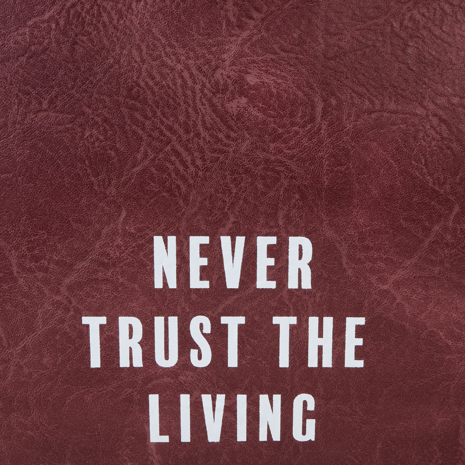 Book a trip for a spirited good time! Make a fashionable escape with our Beetlejuice: Handbook for the Recently Deceased Pin Trader Backpack. This functional and versatile backpack features a pin-trading “page” that’s perforated for storing and displaying your favorite pins. A front-flap strap secures the front “cover,” which features embroidered letters spelling out “Handbook for the Recently Deceased.” A clear material creates a shiny, laminated effect for viewing the artwork on the front cover. Just like the book in the movie, the “cover” for this “book” displays a couple holding hands, preparing to journey into the afterlife. “Weathered” brown faux leather creates an authentic look, and the lettering down the “spine” adds a realistic touch. Also, you can start your collection with an enamel pin of a Sandworm, which comes with this backpack. On the back, white lettering spells out a warning: “Never Trust the Living.” Pack just what you need for the day to visit your favorite haunts in style.