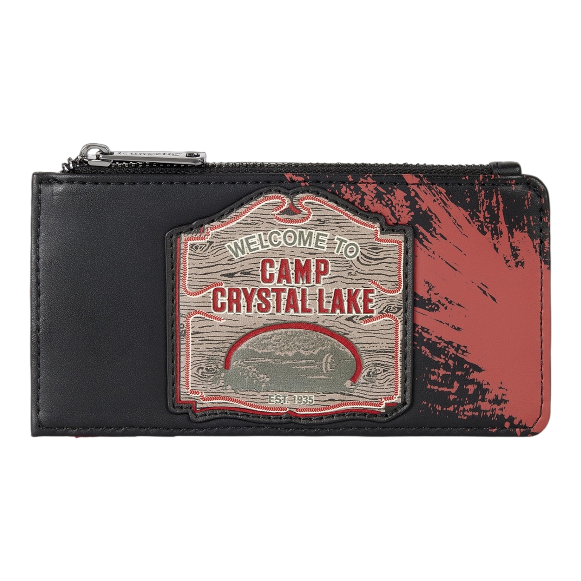 This card holder features the "Camp Crystal Lake" sign on the front. The front and back are "splashed" with blood. Turn it around to find four card slots and a zippered compartment to store essentials.