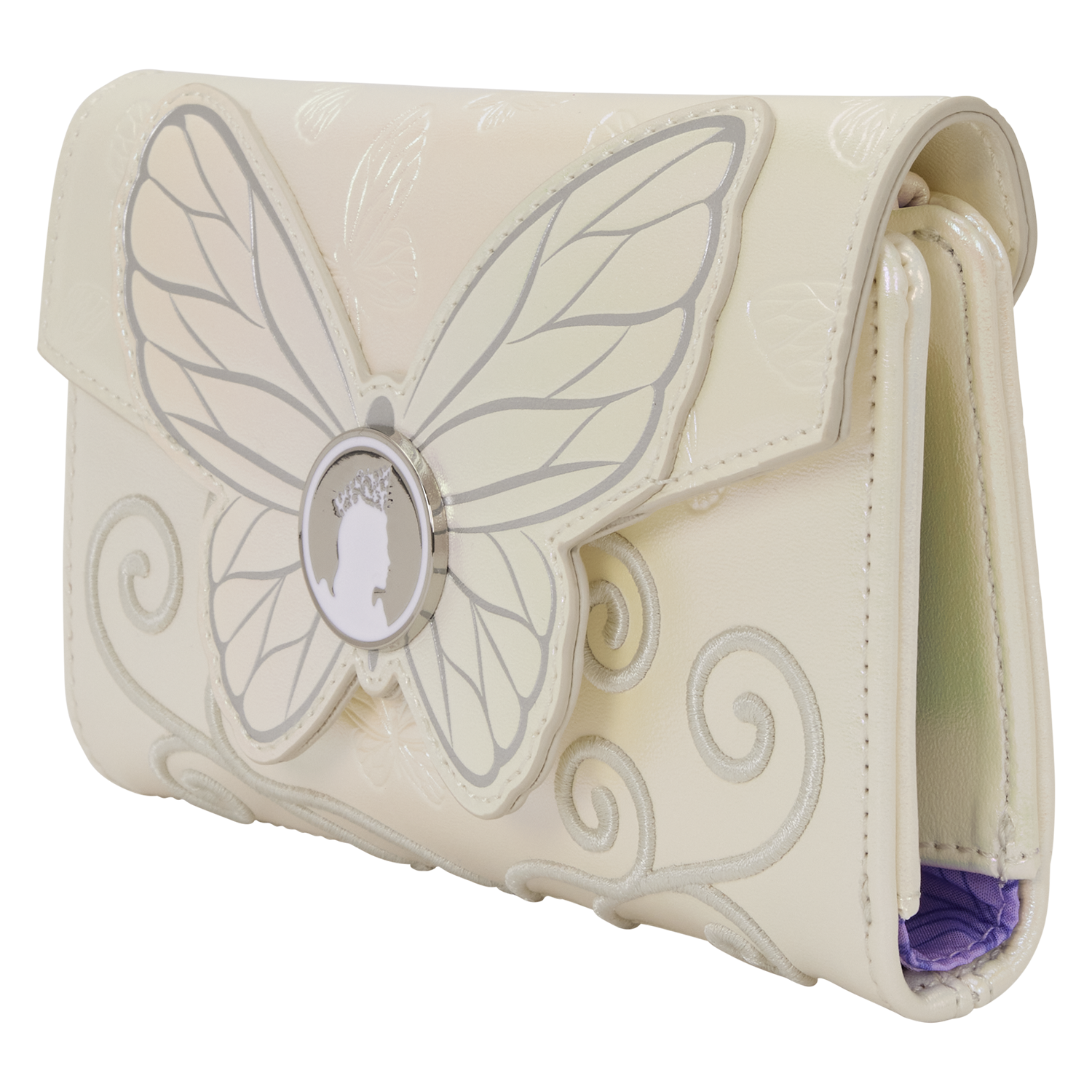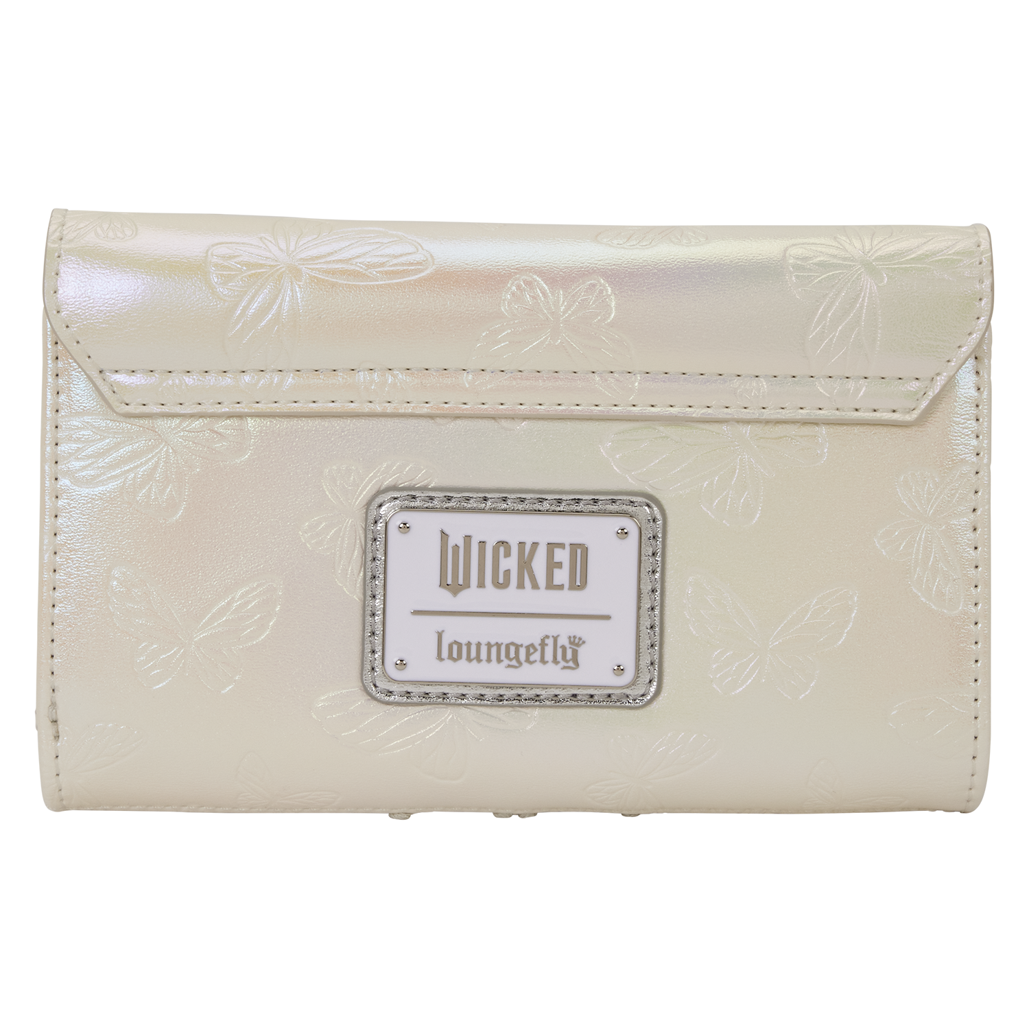 This gorgeous wallet is pearlescent with debossed butterflies and raised tonal embroidery of elegant swirls. On the front, you'll find a large butterfly with an enamel charm that has Glinda's silhouette within it! Open it up to find seven card slots and one clear ID slot. It's the perfect accessory to show off your love for all things Wicked.