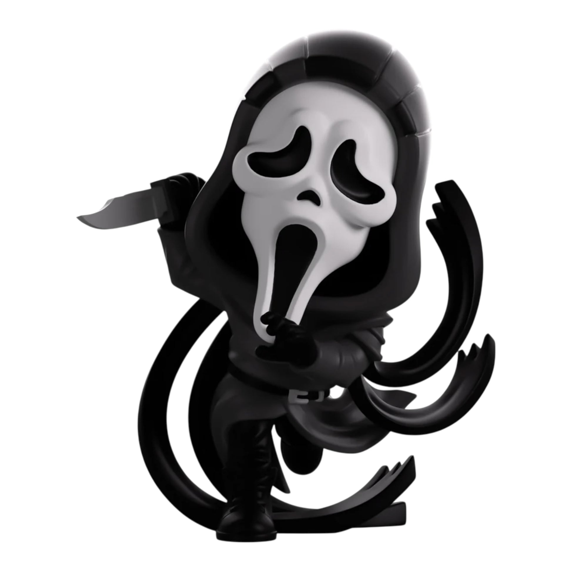 "Do you like scary games?". Ghost Face has tracked down Youtooz, ready and waiting for his next kill! Sprinting forward at 4.6 inches tall with tendrils of his black cloak flying around him as he raised a knife ready for a final kill, his white Ghost Face mask is framed within the black hood of his cloak to truly emobdy fear. The windowed display box has been illustrated to show Ghost Face peeking around the side of a crumbling brick wall in front of tall grass. While the interior is a black silhouetted forest with a glowing red and blue haze and the white ‘Dead by Daylight’ logo at its back, this grim motif then continues onto the protective sleeve with dark trees surrounding it completely as their figure can be seen through the large clear window at its front. This collectible ships in a matte, embossed, protective outer sleeve and a custom sized plastic protector for maximum protection during shipping.