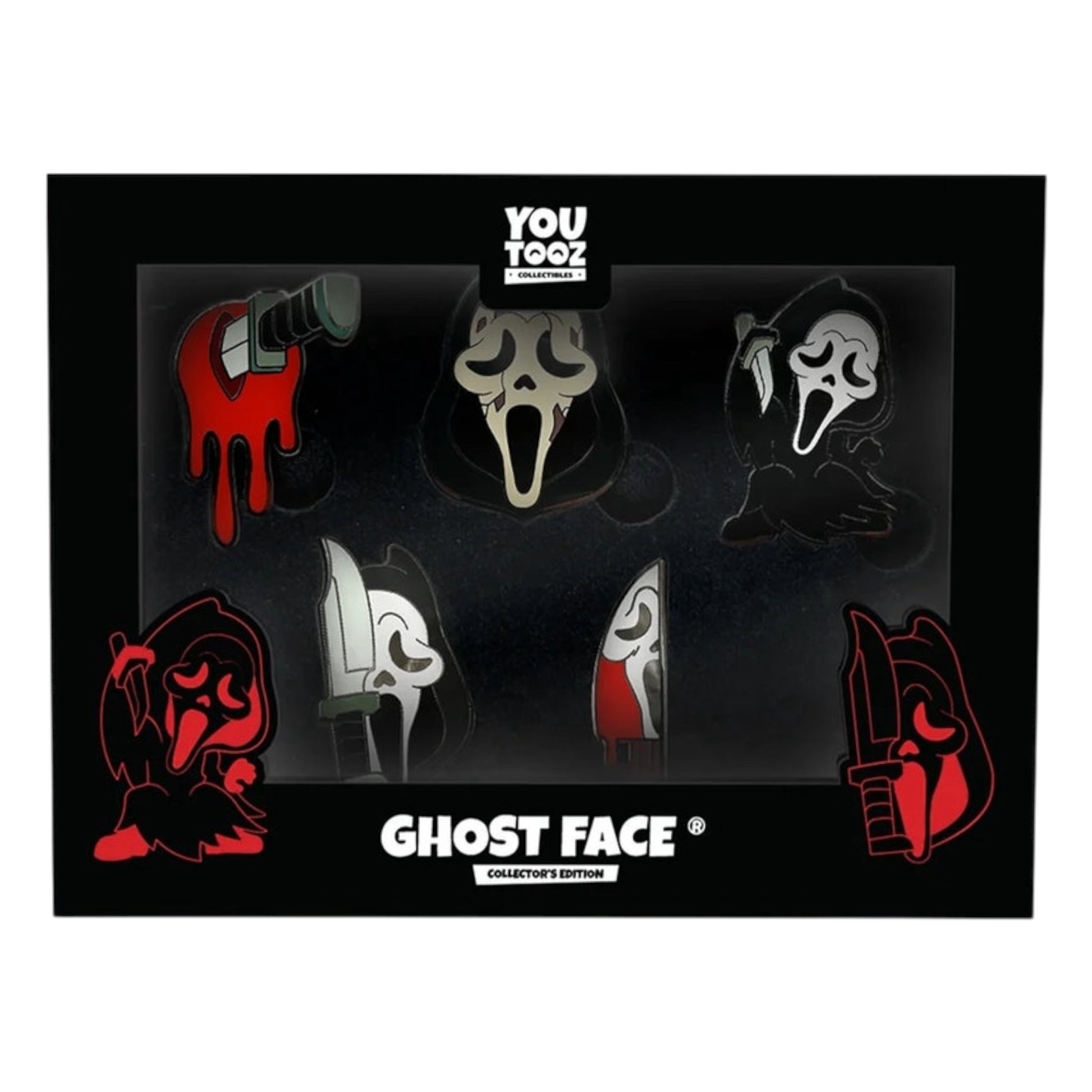 True horror fans wear their favourite killers on their coats! This 5 piece Ghost Face pin set is to die for! This pin set contains 5 unique and high-quality enamel pins with a shiny finish. The Ghost Face pin set includes a knife stabbing something with blood around it, a cracked and discolored Ghost Face mask, Ghost Face with their right arm raising a knife, a Ghost Face mask that is half covered by a knife, and a bloody knife with a Ghost Face mask reflecting in the blade. These pins are perfect as decoration on a cork board or showing off on your tote bag, backpack, fanny pack, jacket or wherever your heart desires. These pins are sure to turn heads and catch the eyes of anyone you pass, showing off that you love a camp killer!